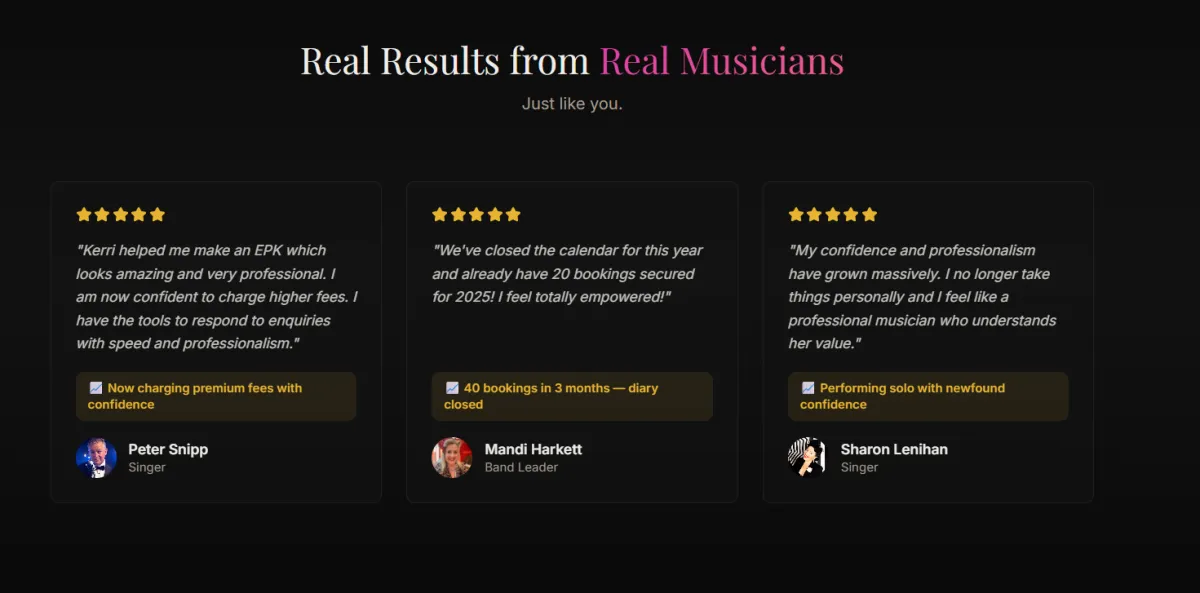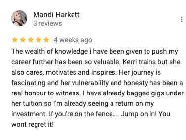 Working with Kerri has been an absolute game changer for me. Kerri’s support and expertise have been invaluable. She helped me create my first professional promo document and I now feel confident putting together my own for all my different acts. Having everything about my act in one concise, beautifully organised document that’s easy to update has taken away so much of the stress. What used to feel daunting now feels streamlined and actually enjoyable. One of my biggest breakthroughs has been gigging solo with backing tracks. I had practised with them for years but never imagined I would actually perform on my own. Now I really enjoy it and it’s opened up a whole new world of opportunities for me. My confidence and professionalism have grown massively. I used to feel overwhelmed by the business side of getting gigs and worried about approaching clients. Through Kerri’s course I’ve learned that selling is really about sharing my skills and helping people create the event they want. That mindset shift has changed everything. Before joining I felt unsure, anxious and a bit lost with how to present myself. Now I feel confident, capable and proud of what I offer. I no longer take things personally and I feel like a professional musician who understands her value. Working with Kerri has given me clarity, confidence and the tools to grow in a way that feels aligned with who I am. I’m so grateful for the transformation this has sparked in my career.