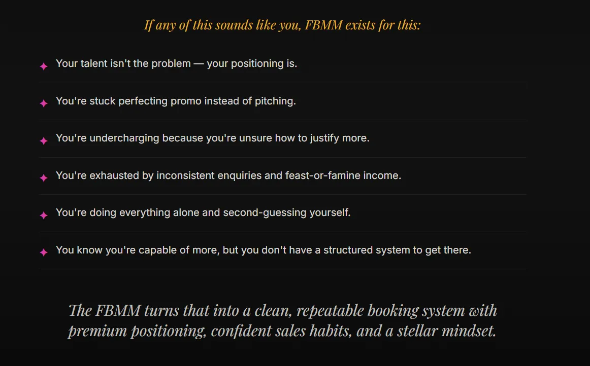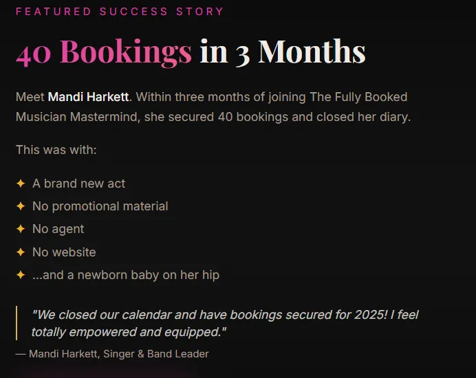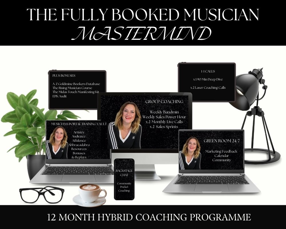 The Fully Booked Musician Mastermind (FBMM) gives you in-depth strategic guidance, structured accountability, industry insight, and psychological coaching, so you can build consistent bookings, increase your fees, and finally see your bank balance reflect the talent and effort you put into your craft.