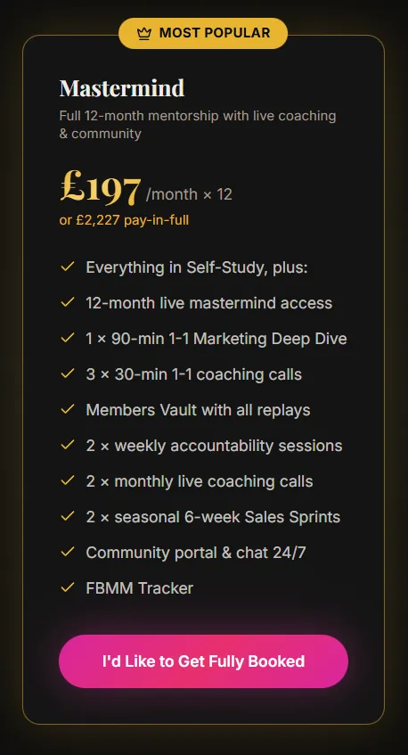 You’ll build a clear, repeatable booking system, based on seasonal cycles, that fills your diary intentionally, increases your average fee, and gives you a rhythm you can rely on.