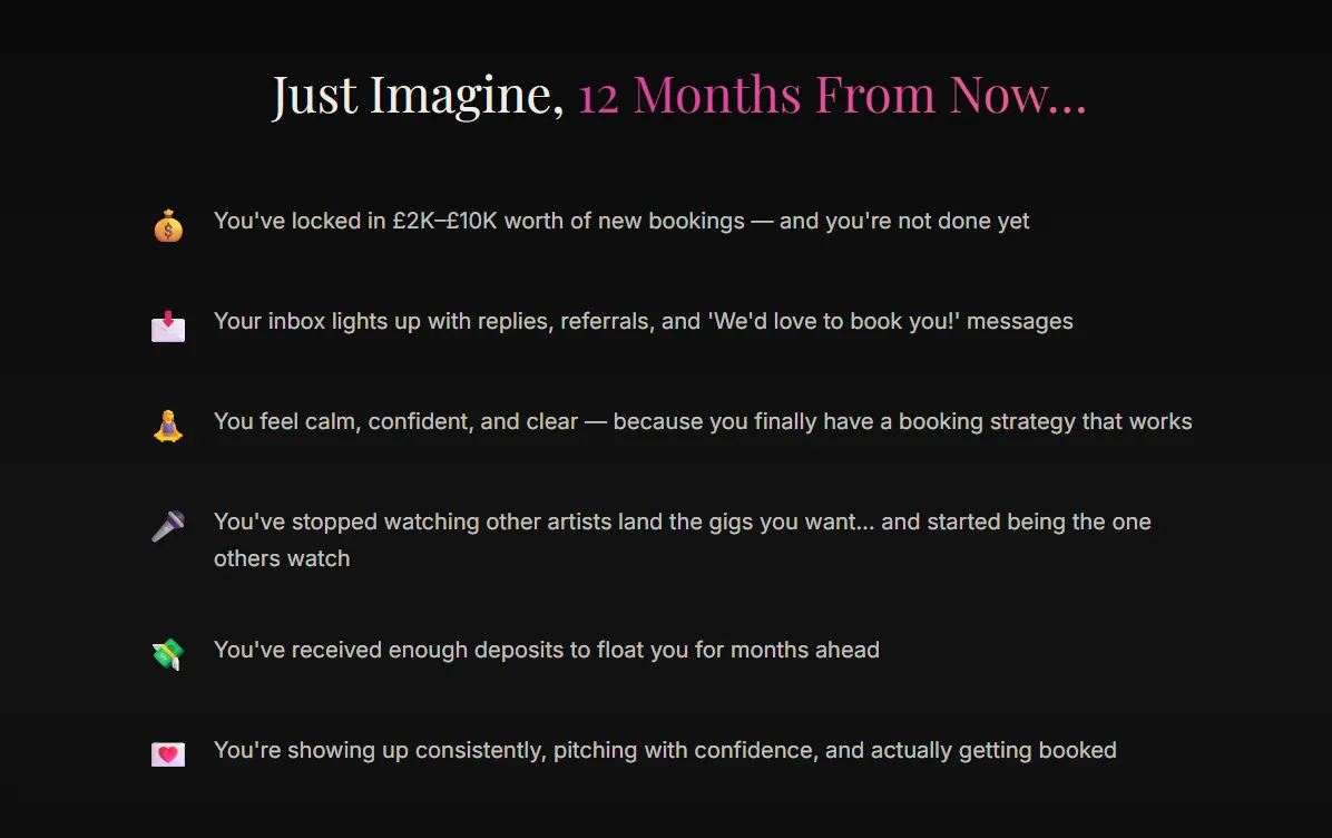 Inside, you’ll receive hands on, expert guidance from a live booking agent with over 20 years of industry experience, alongside the strength and accountability of a dedicated community of musicians committed to raising their standards.