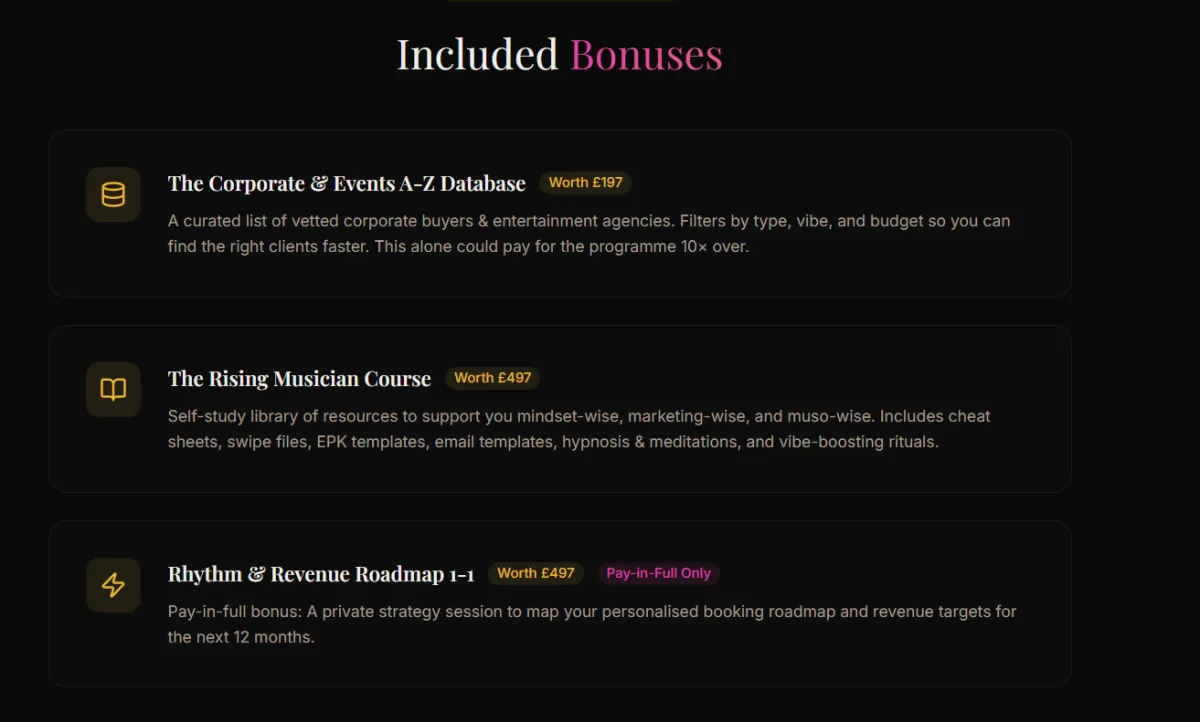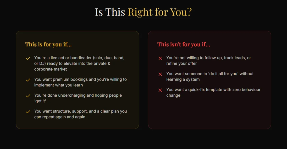 Many members build their premium booking system alongside other work. The goal is consistency and growth, not overnight risk. We do keep office hours with our calls however - so this suits musicians who are decicated to create a full-time event and live music business.